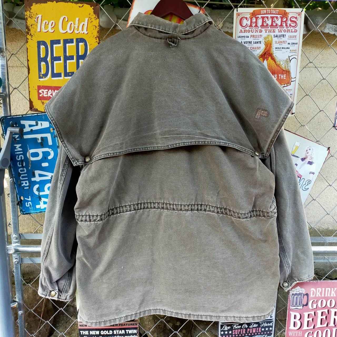 カラーはフェードがかったグレーブラウンで、着込まれた風合いがストリートスタイルやアメカジコーデに自然と馴染みます。秋から冬にかけてはスウェットやパーカーの上に羽織るアウターとして活躍し、春先には軽めのインナーと合わせることでラフなワークスタイルが完成します。