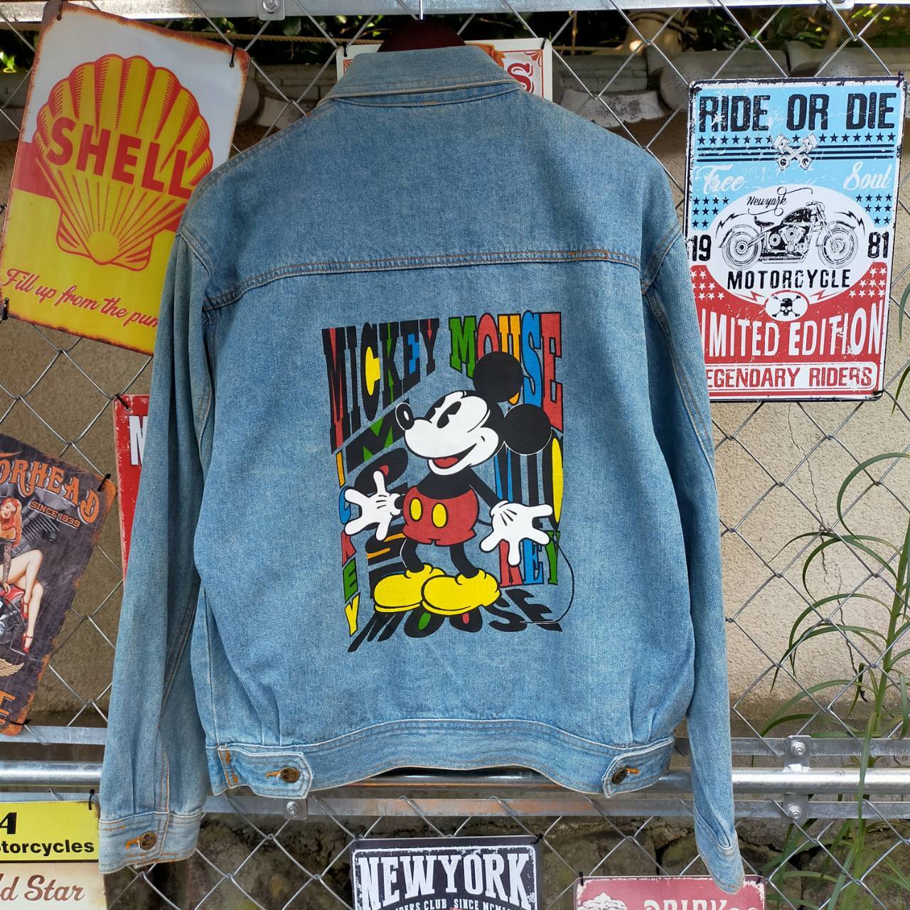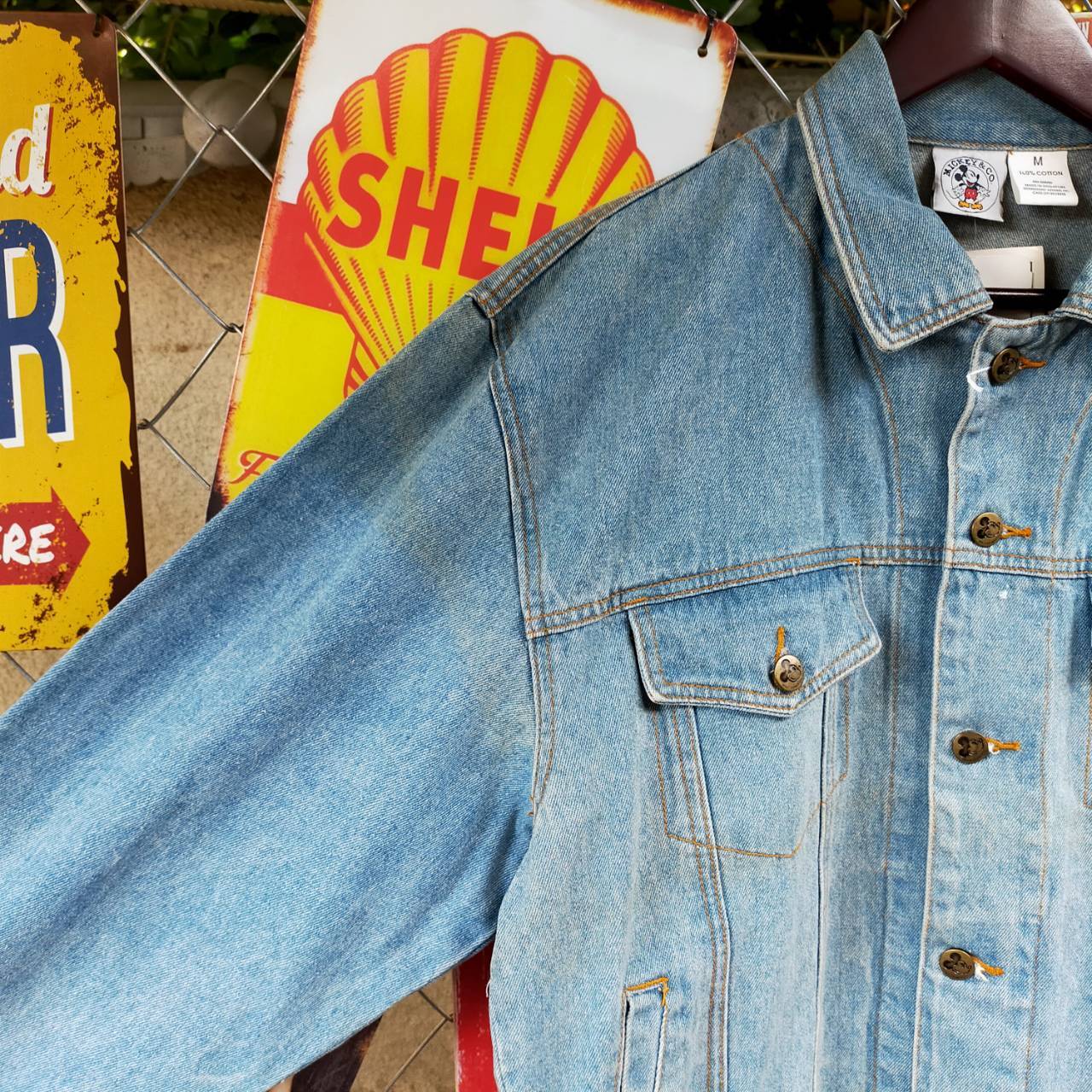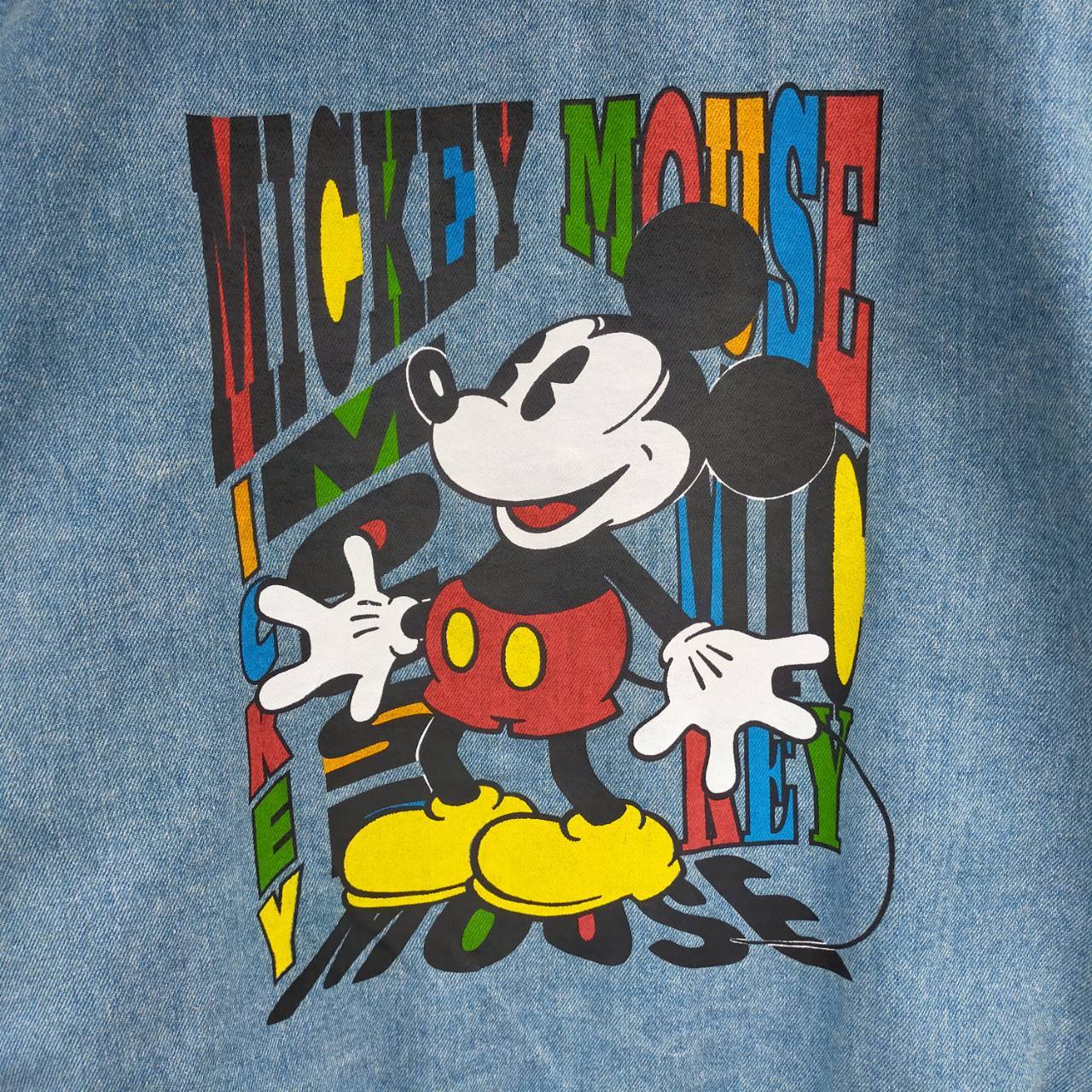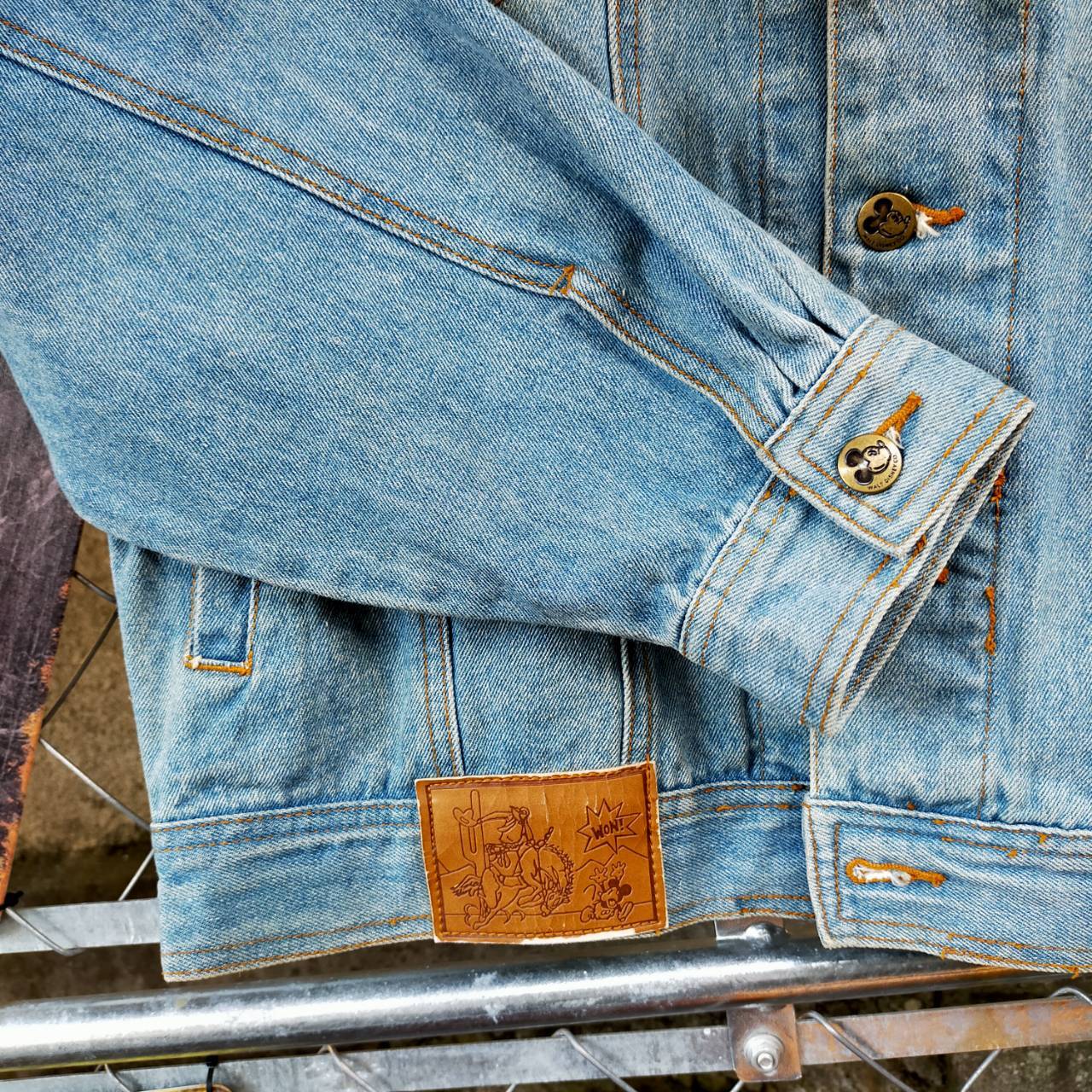 MICKEY & COのデッドストックデニムジャケットです。フロントはシンプルなデザインながら、背面には大きくカラフルなミッキーマウスのプリントが施されており、存在感のある一枚に仕上がっています。ボタンやレザーパッチにもミッキーのデザインが入っており、ディズニー好きにはたまらない特別なアイテムです。