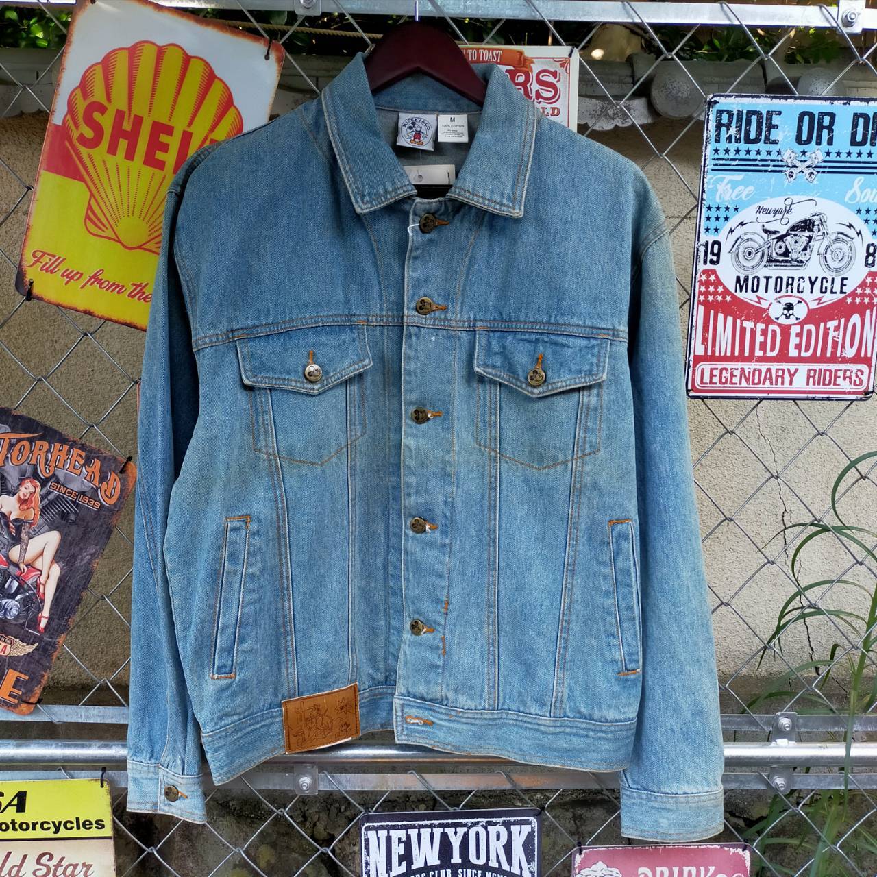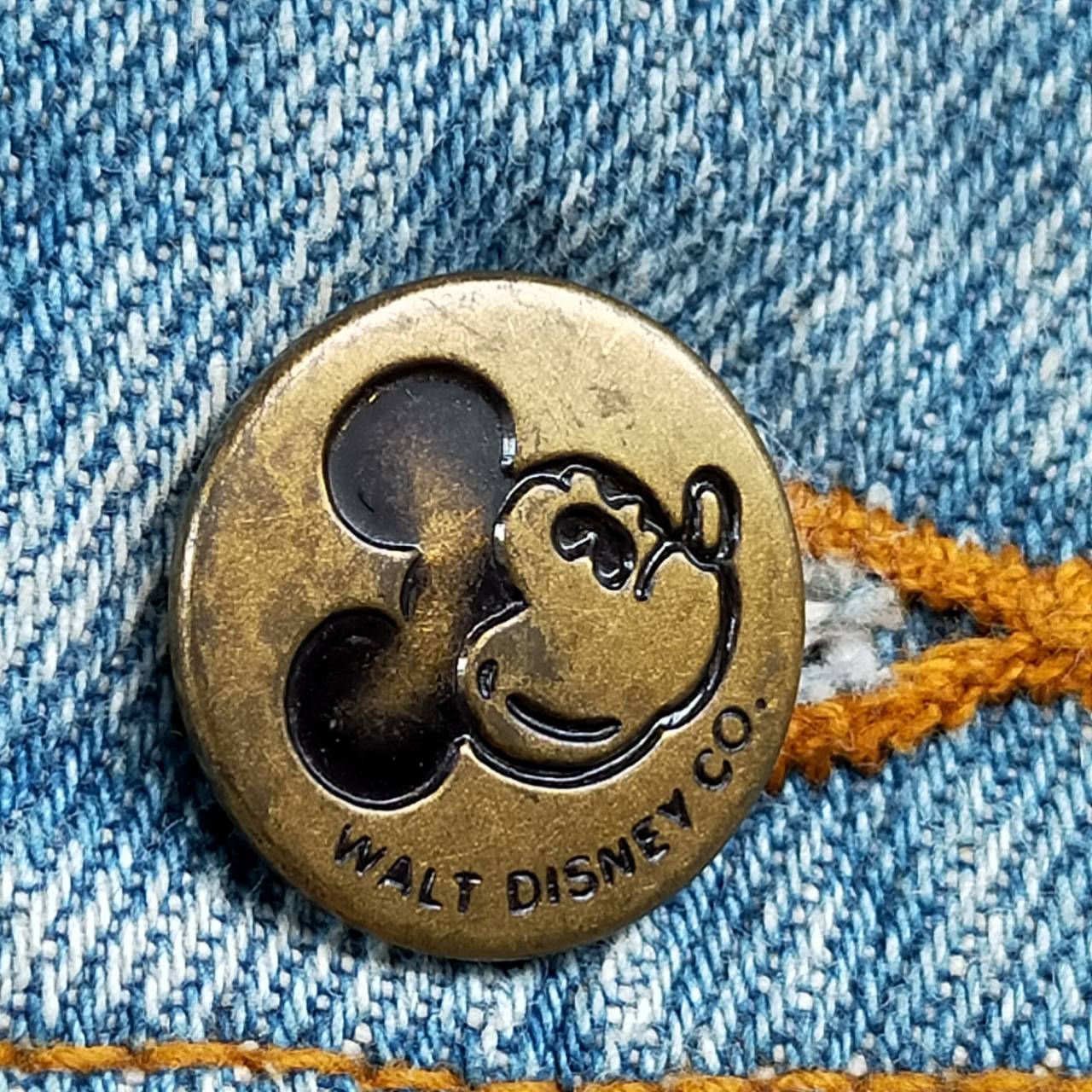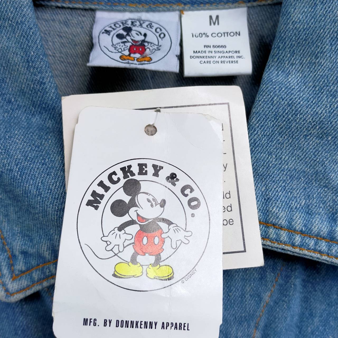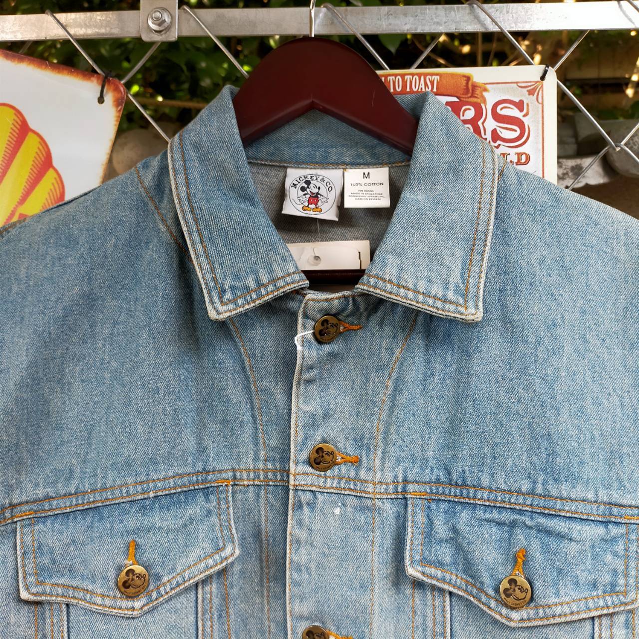 MICKEY & COのデッドストックデニムジャケットです。フロントはシンプルなデザインながら、背面には大きくカラフルなミッキーマウスのプリントが施されており、存在感のある一枚に仕上がっています。ボタンやレザーパッチにもミッキーのデザインが入っており、ディズニー好きにはたまらない特別なアイテムです。