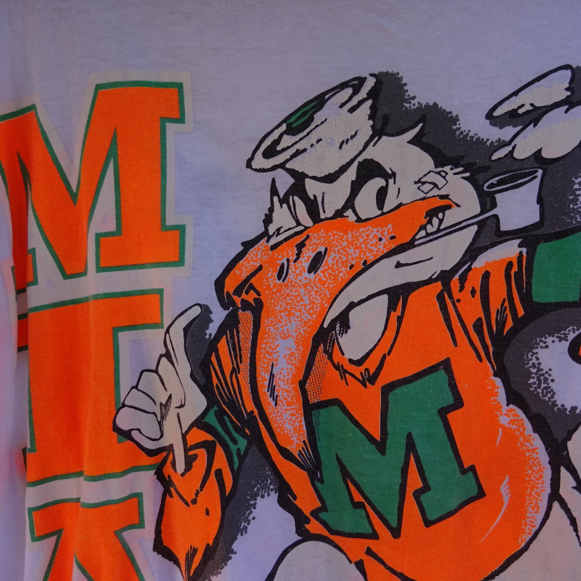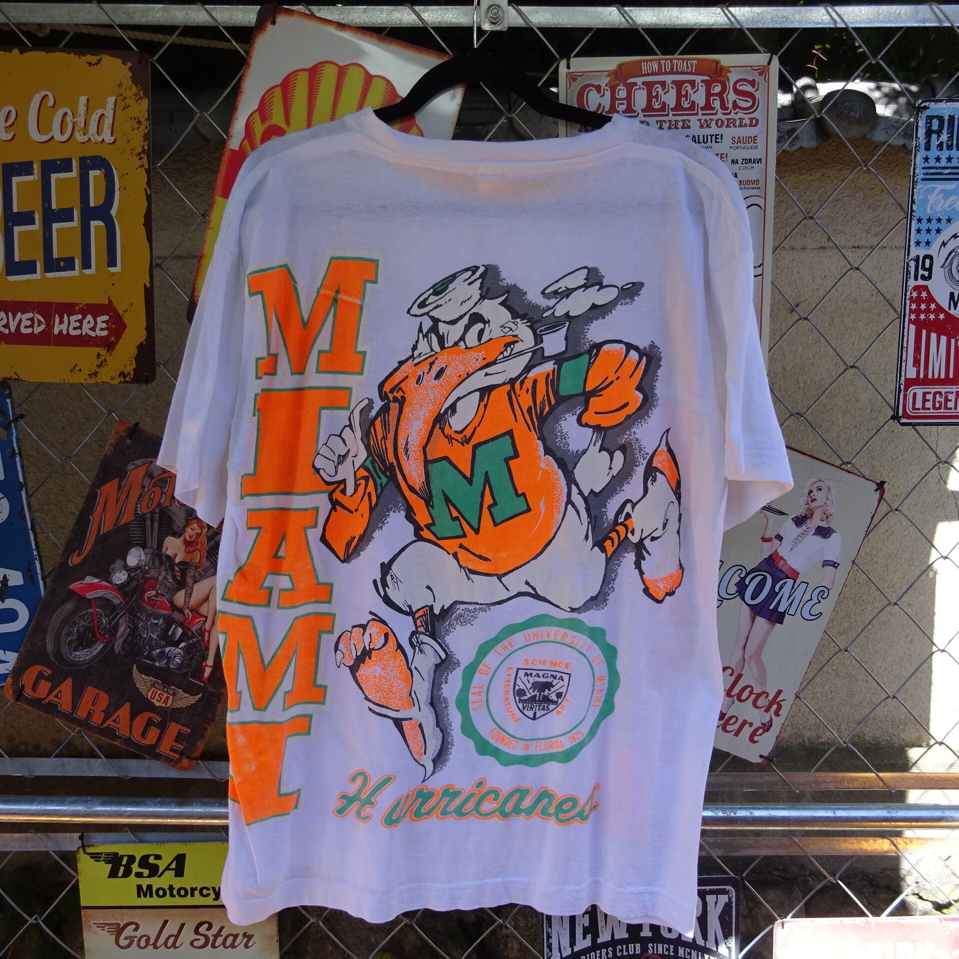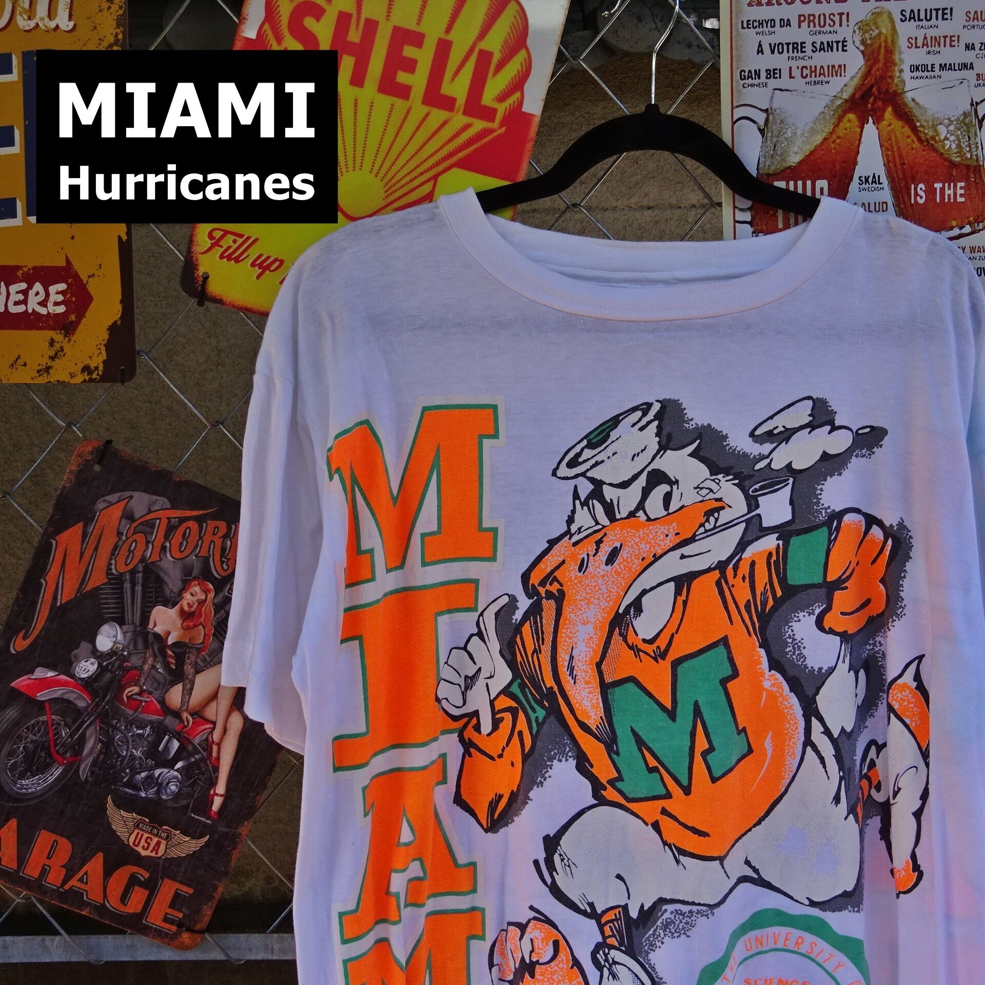MIAMI HurricanesのUSA製Tシャツが入荷しました。LサイズのこのTシャツは、両面にプリントされたフットボールチームのマスコットが目を引きます。スポーティーで個性的なデザインは、ファッションスタイルをアクセントしてくれること間違いなし!