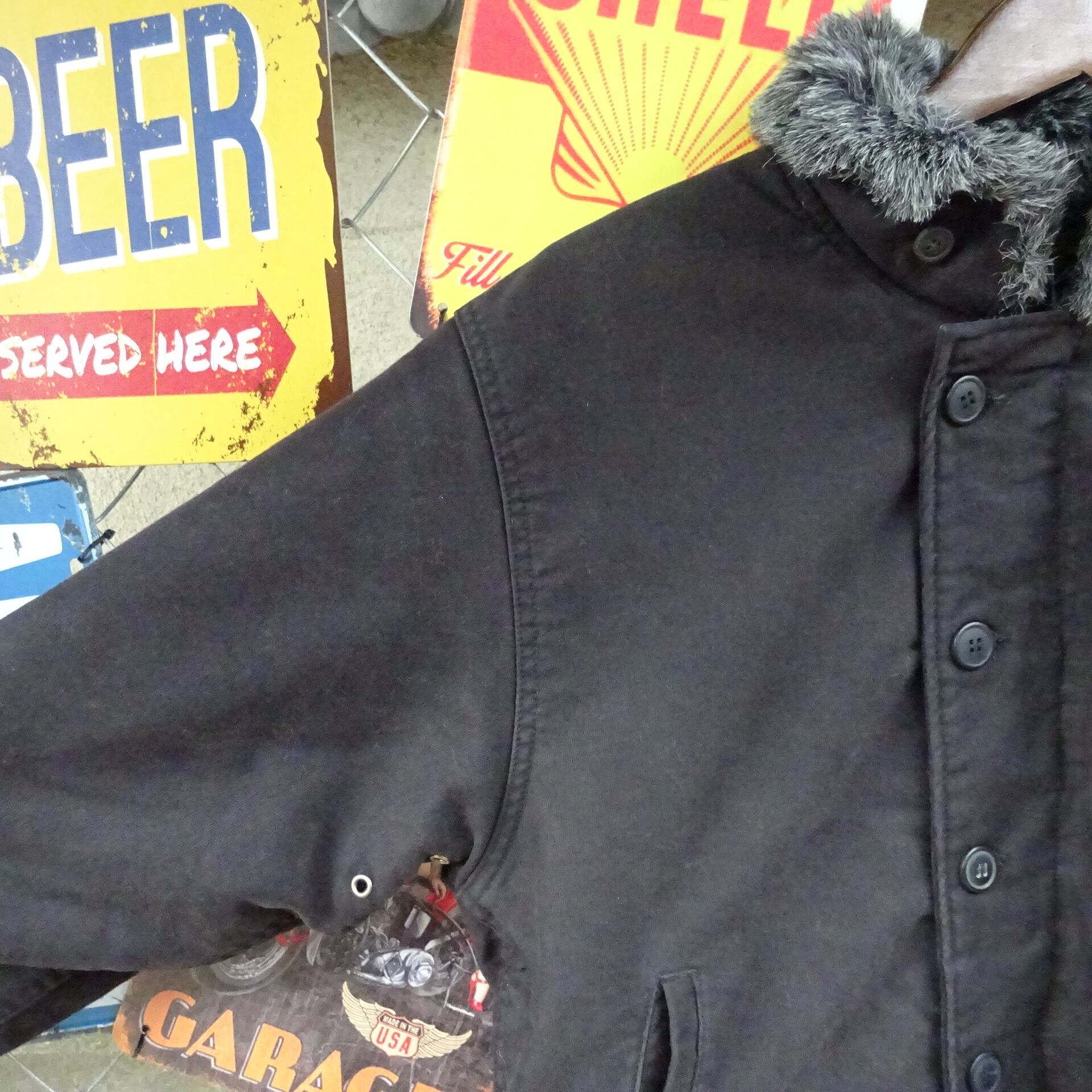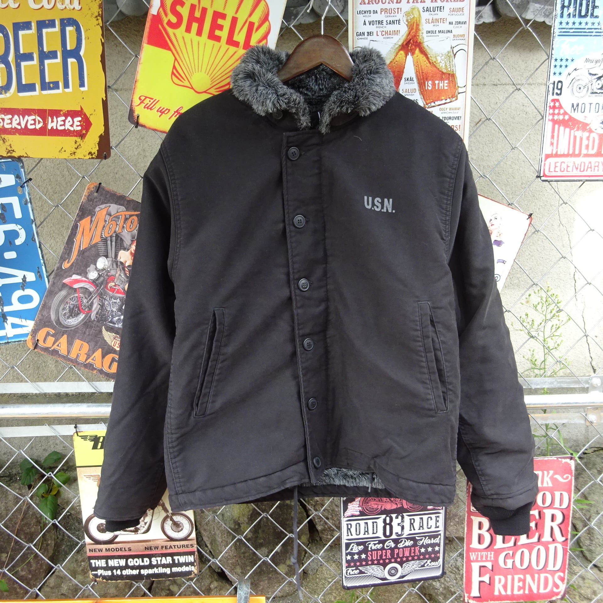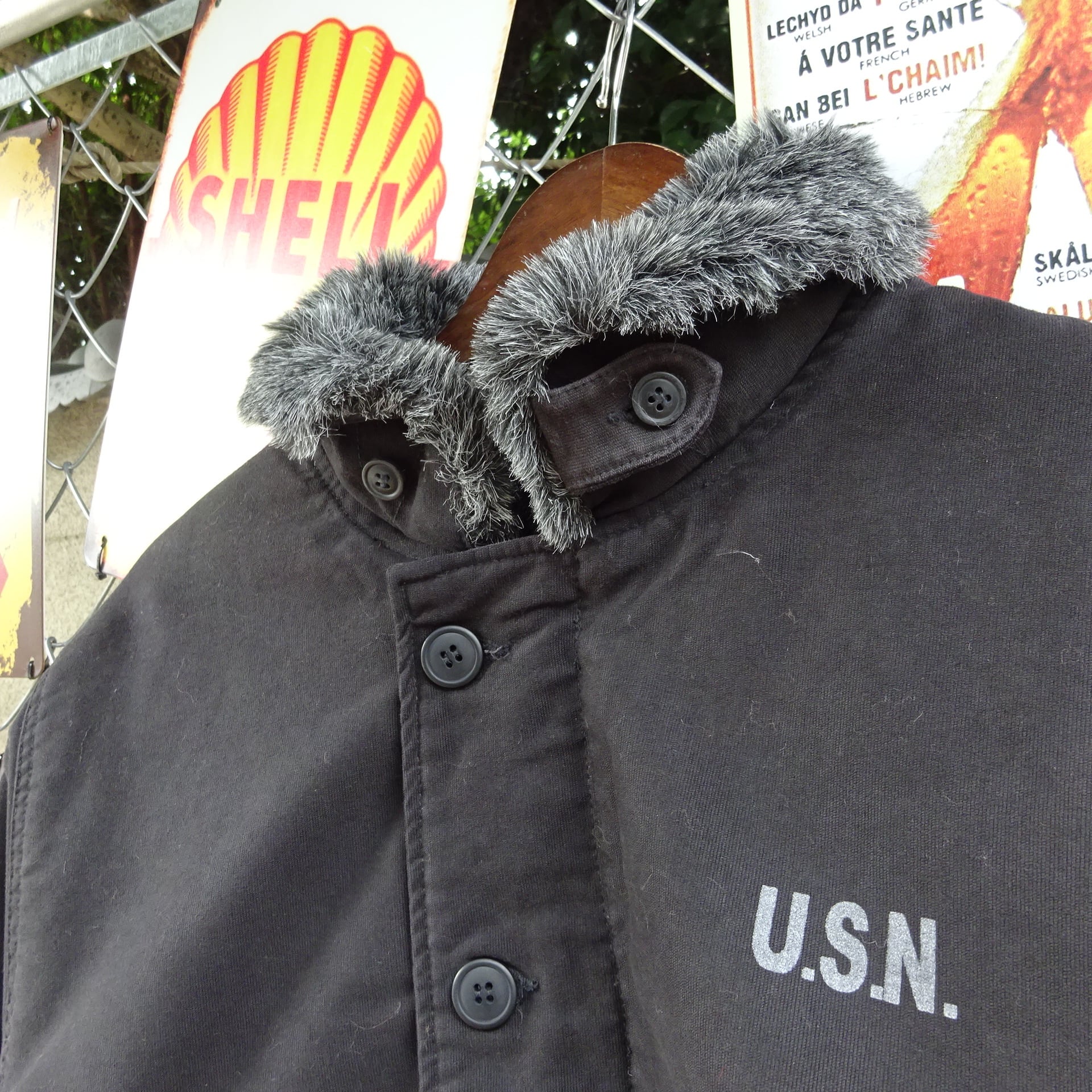 NAVY DEPARTMENT YMCLKY N-1 デッキジャケット 38 L サイズ相当が入荷しました!こちらは米軍N-1 デッキジャケットのレプリカです。シンプルで洗練されたブラックのカラーリングが魅力のこのジャケットは、ミリタリーデザインを取り入れつつも、日常のスタイリングに取り入れやすい一着です。デイリーユースからカジュアルなアウトドアシーンまで幅広く活躍すること間違いなしです。しっかりとした生地感で、着心地も快適です。このジャケットを羽織ることで、あなたのコーディネートにミリタリーな雰囲気をプラスすることができます!